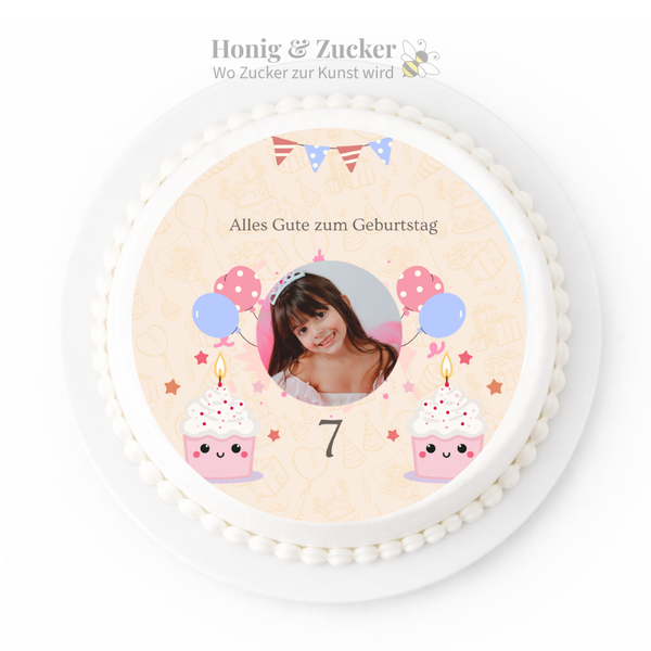 Der Tortenaufleger hat eine runde Form mit ca. 20 cm Durchmesser. Er eignet sich damit für die meisten Standard-Geburtstagstorten. Wenn Sie jedoch eine kleinere Größe wünschen, geben Sie dies bitte an. Dies ist selbstverständlich möglich.