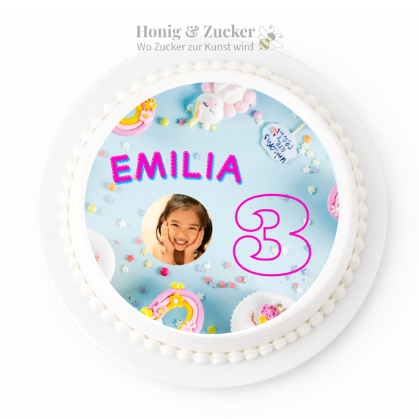 Mit einem personalisierten „Unikorn“ Tortenaufleger wird jede Torte zu einem echten Hingucker. Zudem wird der Aufleger individuell mit Name, Alter und Foto gestaltet. Danach drucken wir ihn auf essbare Oblate oder Zuckerpapier. Dadurch entsteht eine einzigartige Tortendekoration. Diese ist perfekt auf den jeweiligen Anlass abgestimmt.